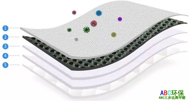 这是一个口罩过滤材料的典型结构图,除了第2层是活性炭层,剩下的4层则是纤维材料、编织方式、过滤原理各有侧重的滤网层。